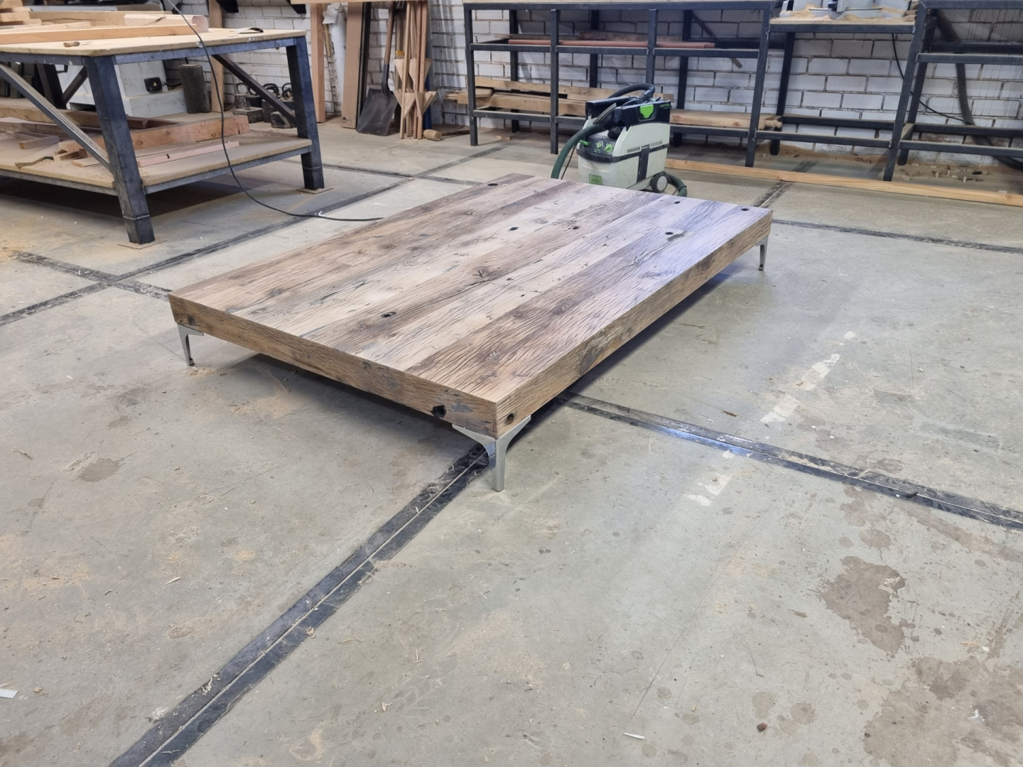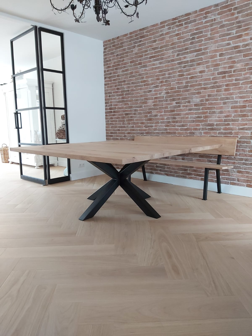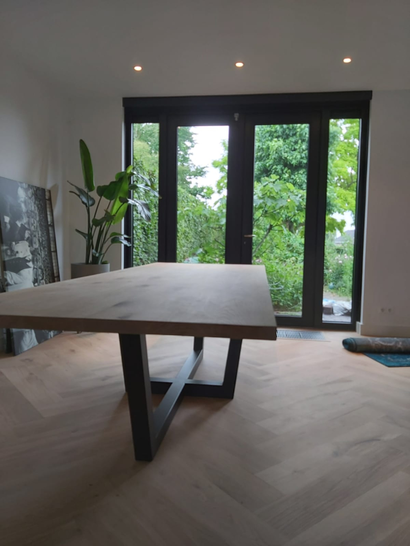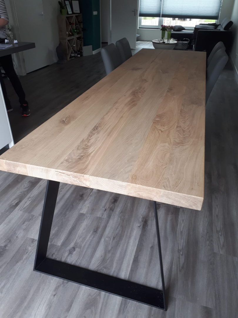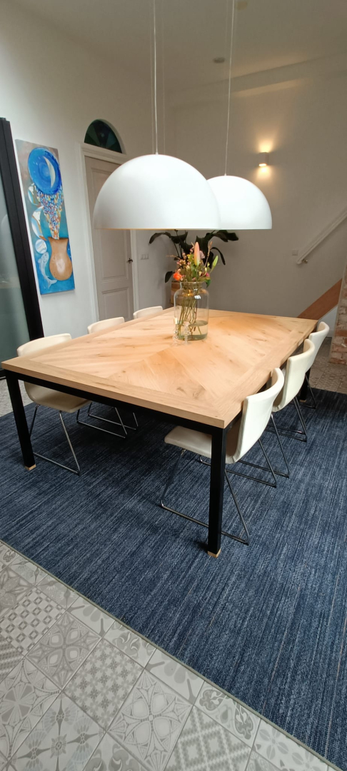 in onze showroom staan altijd diverse soorten tafels in allerlei afmetingen en afwerkingen. Zo krijg je een beeld van de mogelijkheden en kunnen we samen met jou de gewenste tafel uittekenen en produceren. Veelal doen we dit met metalen onderstellen maar traditioneel met houten poten is zeker mogelijk.